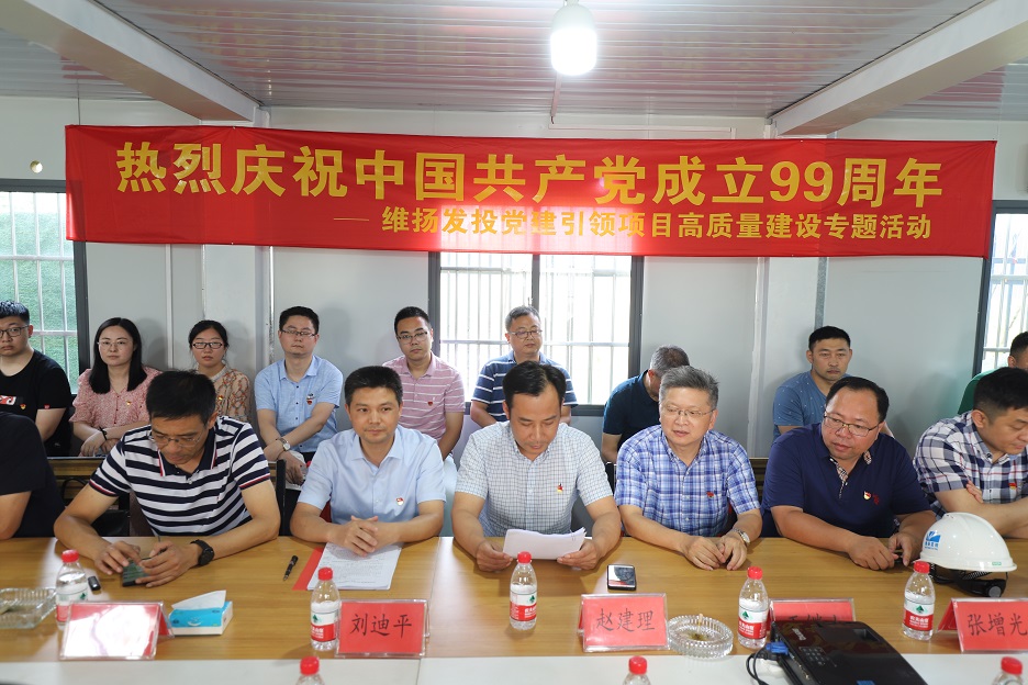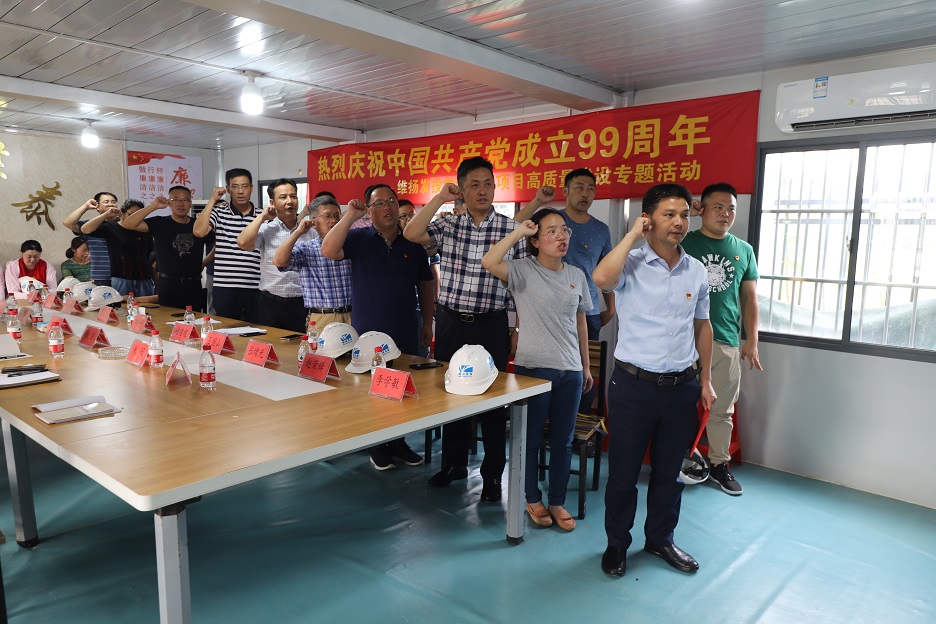 系列活動二:黨建引領(lǐng)項目高質(zhì)量建設(shè)專題活動 6月30日下午,公司黨支部組織公司全體黨員、預(yù)備黨員、發(fā)展對象、入黨積極分子前往創(chuàng)業(yè)路(真州路-揚冶路)道路工程項目部,開展慶祝建黨99周年專題活動。 本次活動共有五項議程:一是聽取項目部匯報;二是維揚發(fā)投與華泰路橋有關(guān)負責(zé)人就創(chuàng)業(yè)路項目建設(shè)的安全生產(chǎn)、揚塵管控、質(zhì)量控制、建設(shè)進度等方面做了詳細交流;三是由公司黨支部書記、董事長劉迪平同志帶領(lǐng)全體黨員重溫入黨誓詞;四是由劉迪平同志為項目部黨員代表授黨員突擊隊隊旗;五是公司黨支部書記講話。 劉迪平強調(diào):“我們要立足項目高質(zhì)量建設(shè),強化黨建引領(lǐng),帶動項目前期工作更加精心,方案設(shè)計更加精當(dāng),工程造價更加精準(zhǔn),項目管理更加精細,維護保養(yǎng)更加精良,讓每一個維揚發(fā)投建設(shè)項目都打上‘精品’的印記?!?/p>